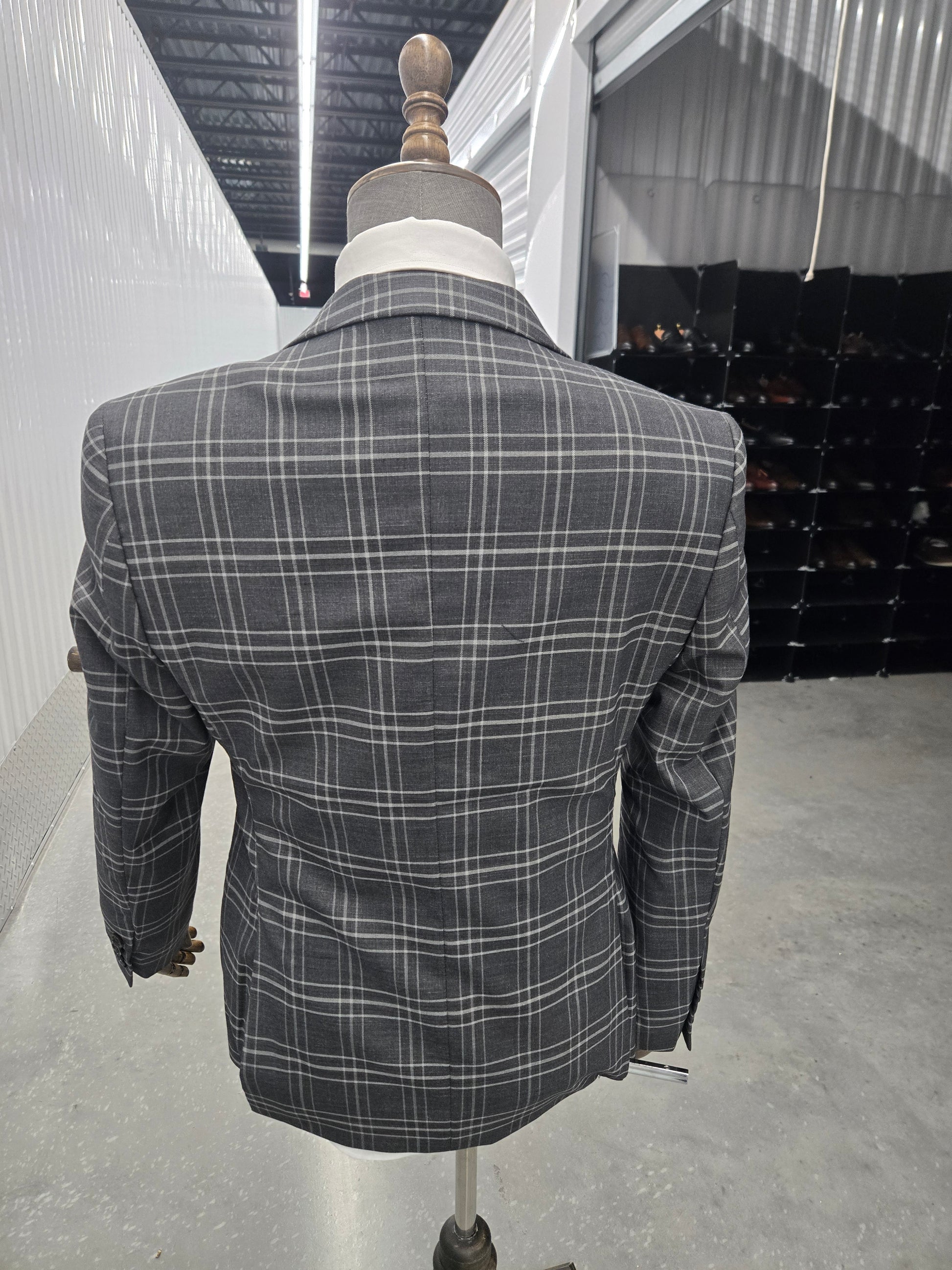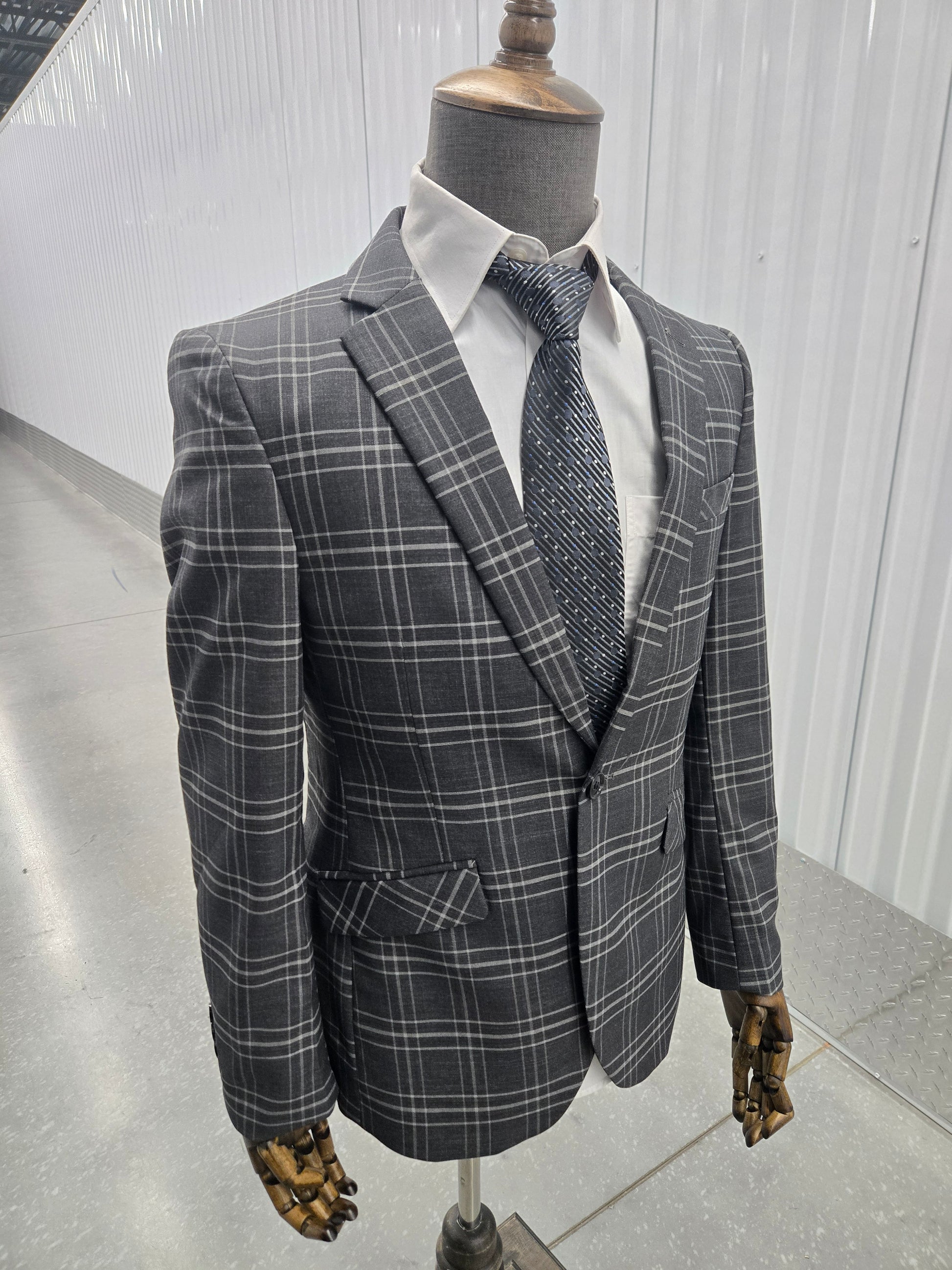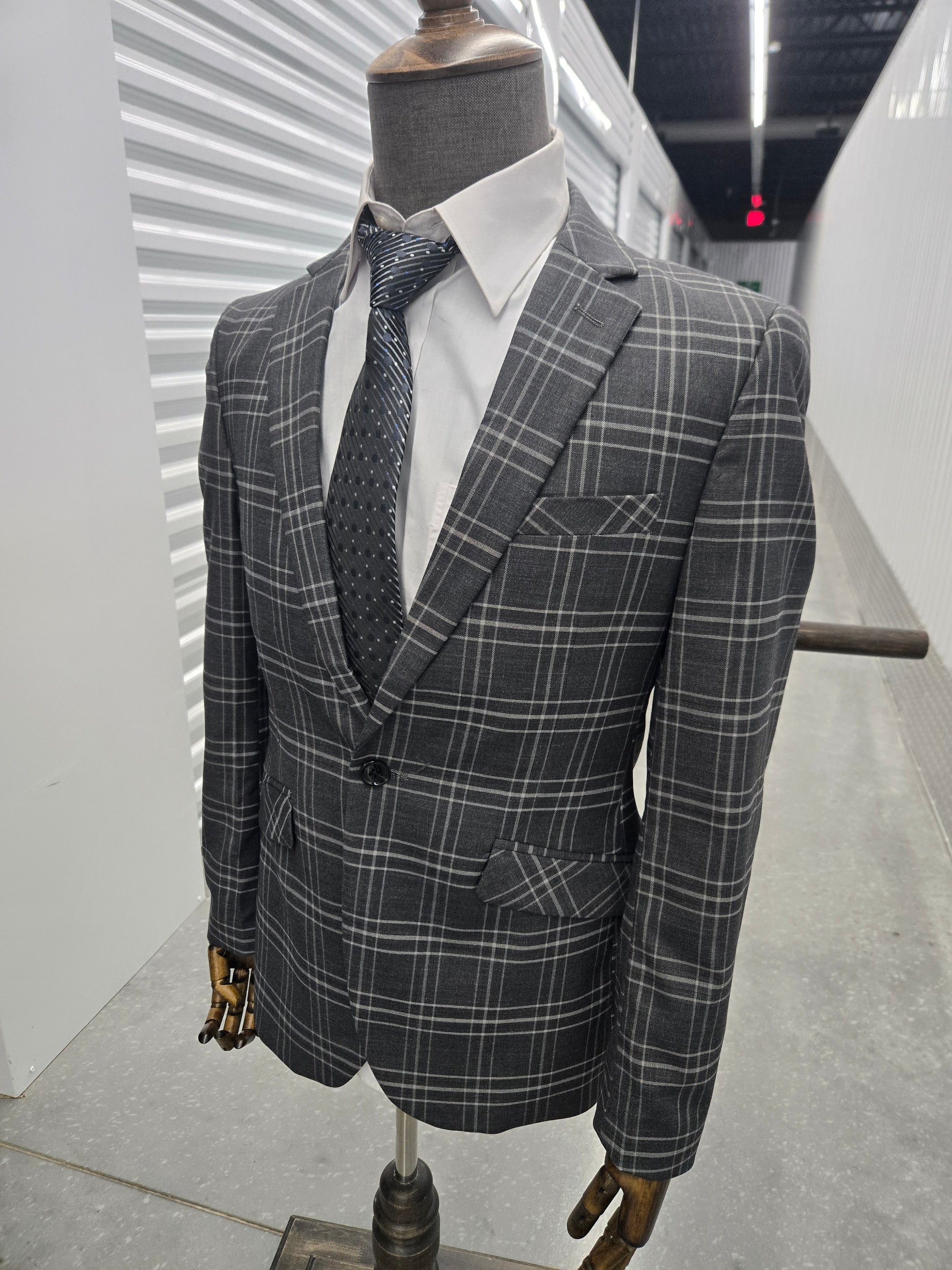 1-Button ,2-Split , Notch Lapel ,Slim Fit Check Ash Blazer.