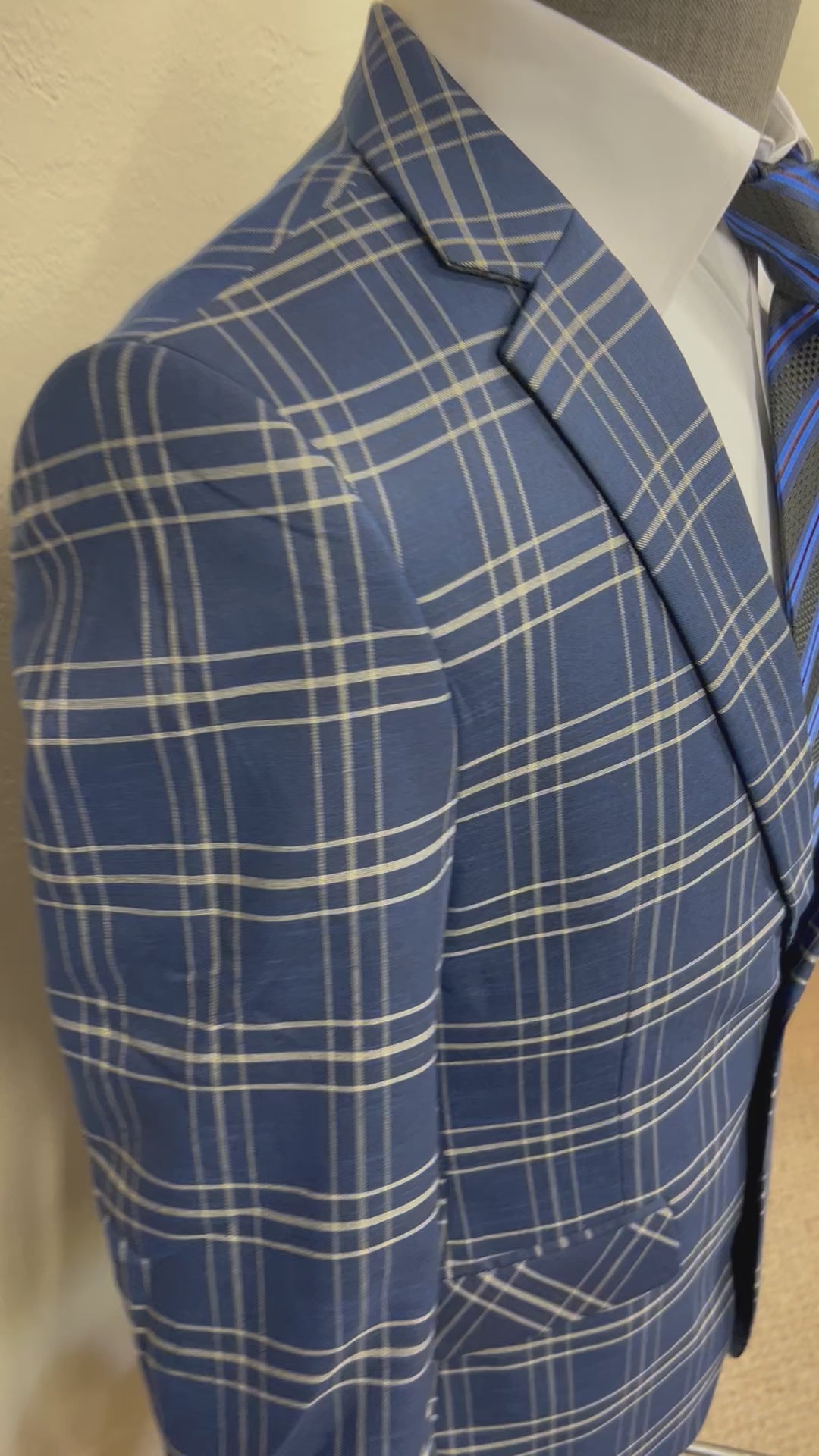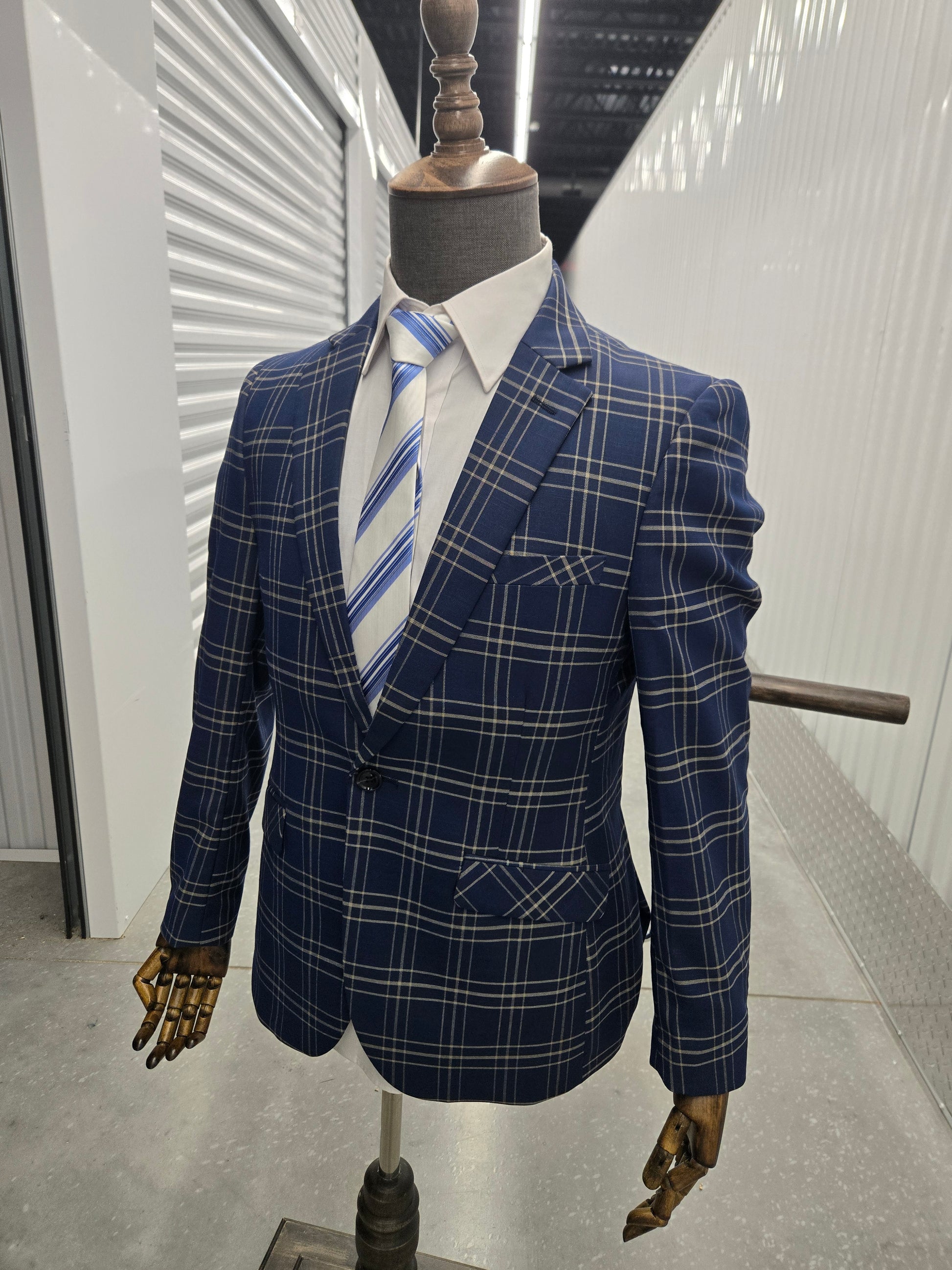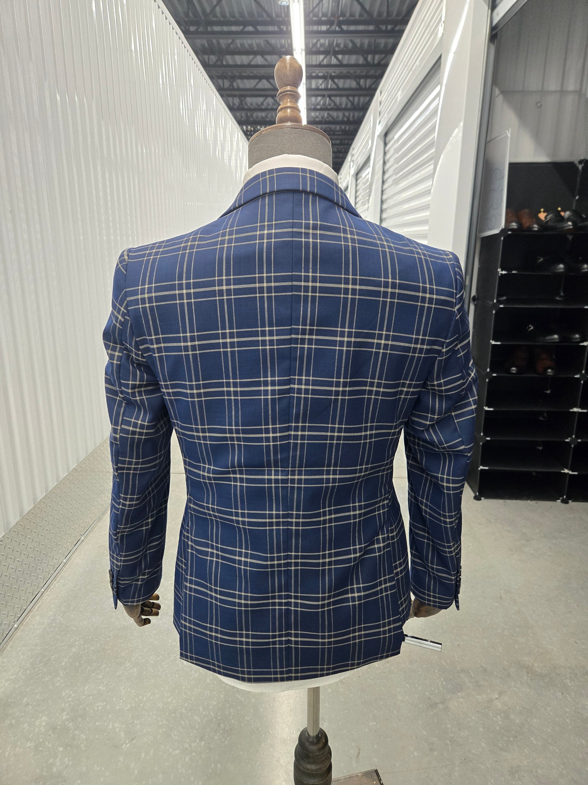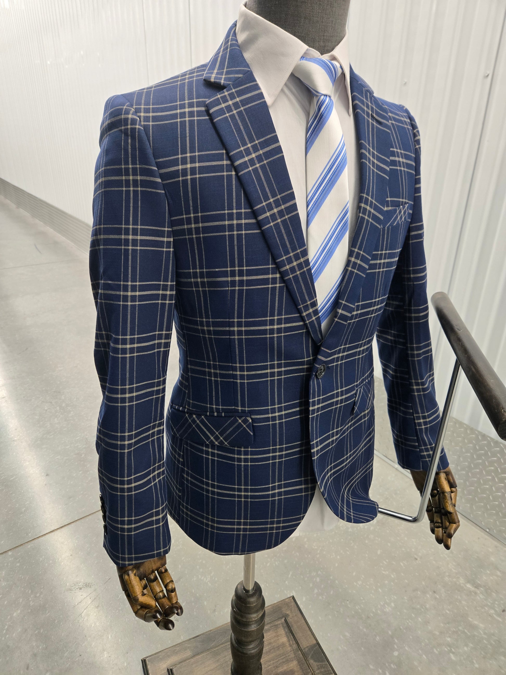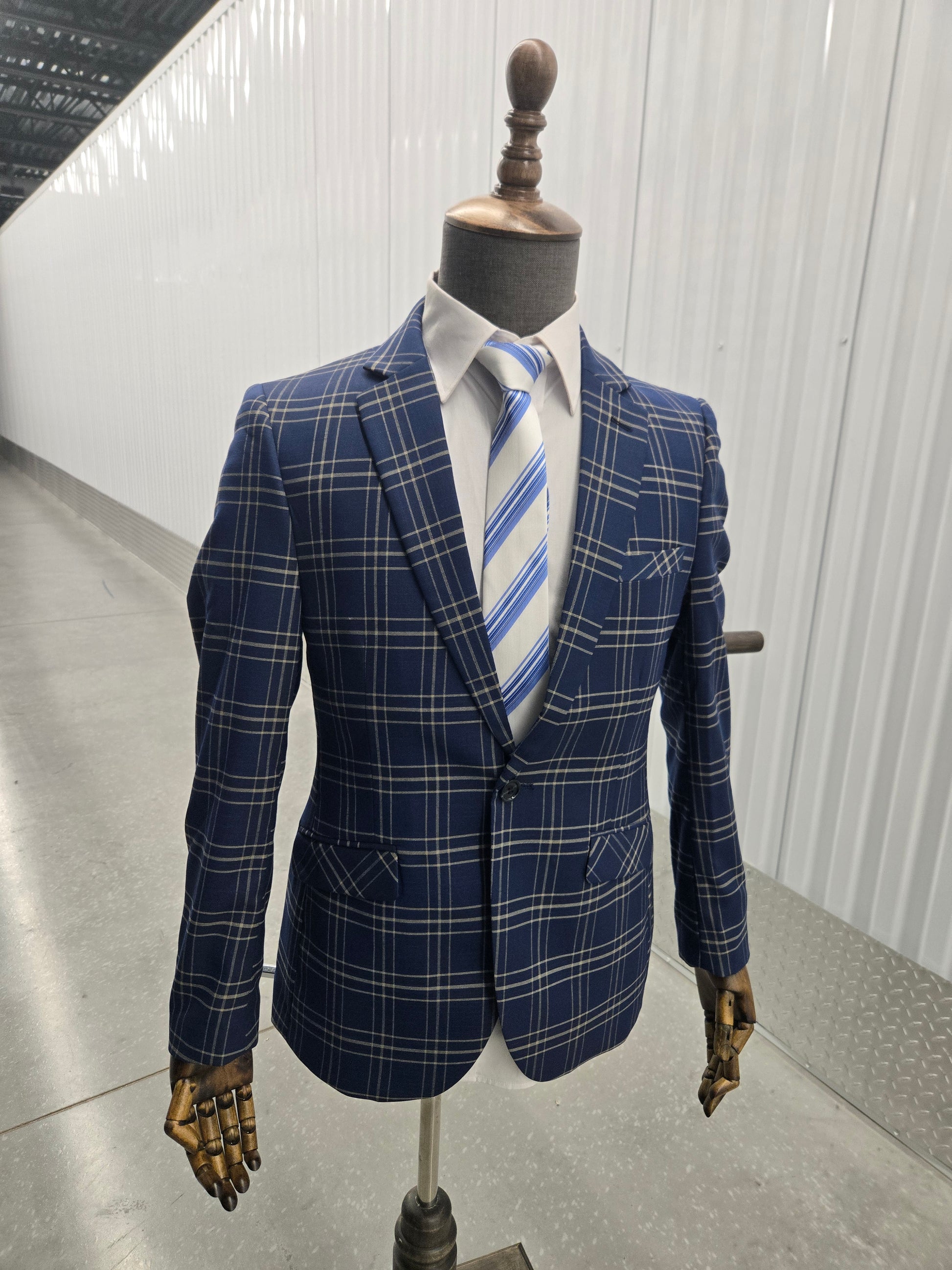 1-Button ,2-Split , Notch Lapel ,Slim Fit Navy Blue Check Blazer.