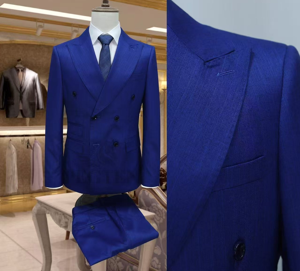 2-Piece Peak Lapel, 6-Button Double Breasted, Blue Slim Fit Suit With Faint Pin Stripes & Peak Lapel.