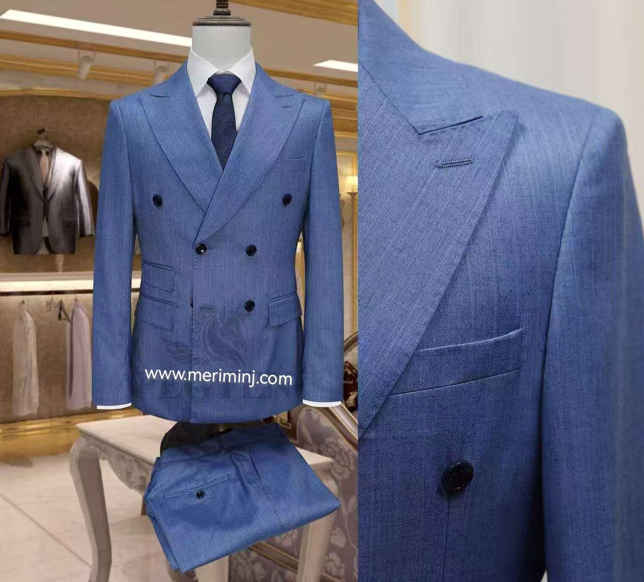 Blue Pin Stripes Slim Fit Double Breasted 6-Button Suit With Peak Lapel